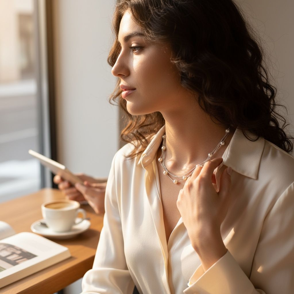 Modelul în trei șiraguri fine oferă un aspect modern și sofisticat, ideal pentru evenimente speciale sau pentru a adăuga o notă de eleganță ținutelor de zi cu zi.