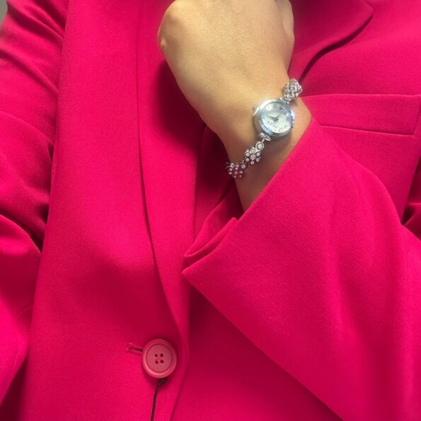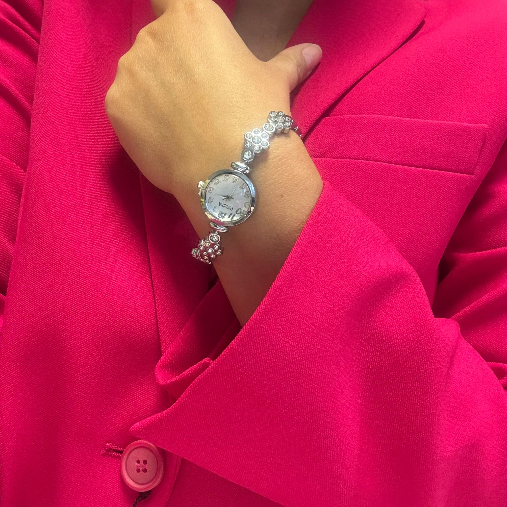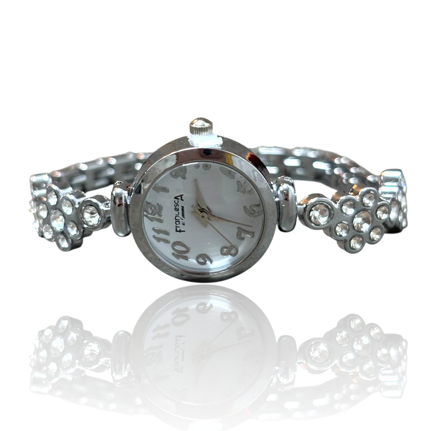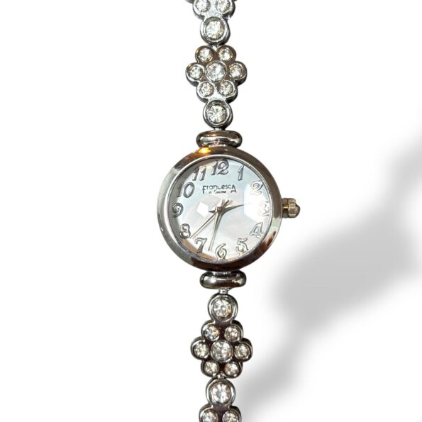 Ceas elegant Francesca Di Geneva, cu brățară metalică argintie decorată cu cristale strălucitoare și cadran sidefat cu cifre reliefate.