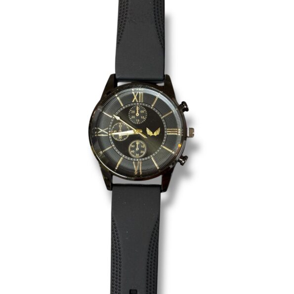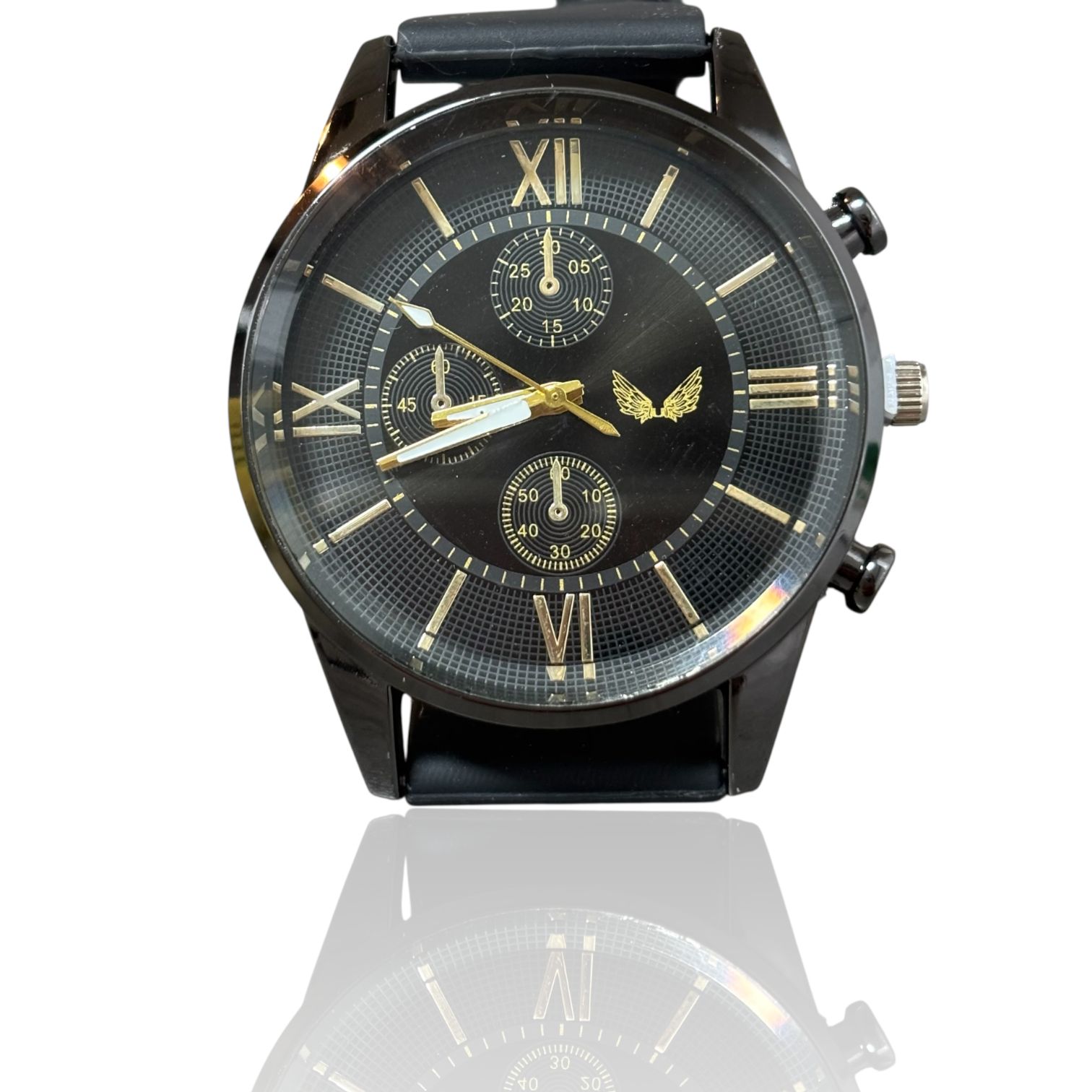Ceas bărbătesc modern, cu cadran negru și detalii aurii, dotat cu mecanism quartz precis.
