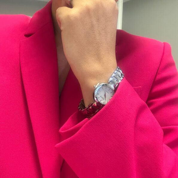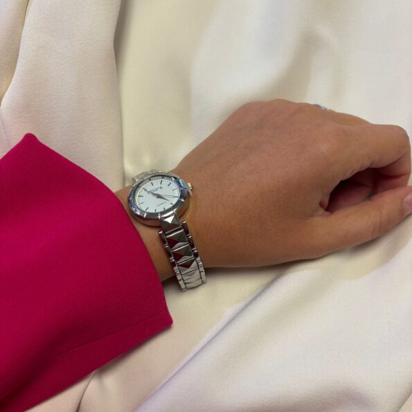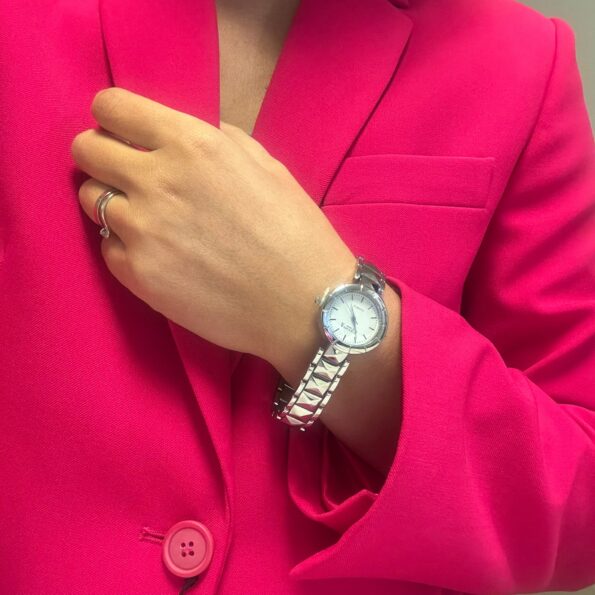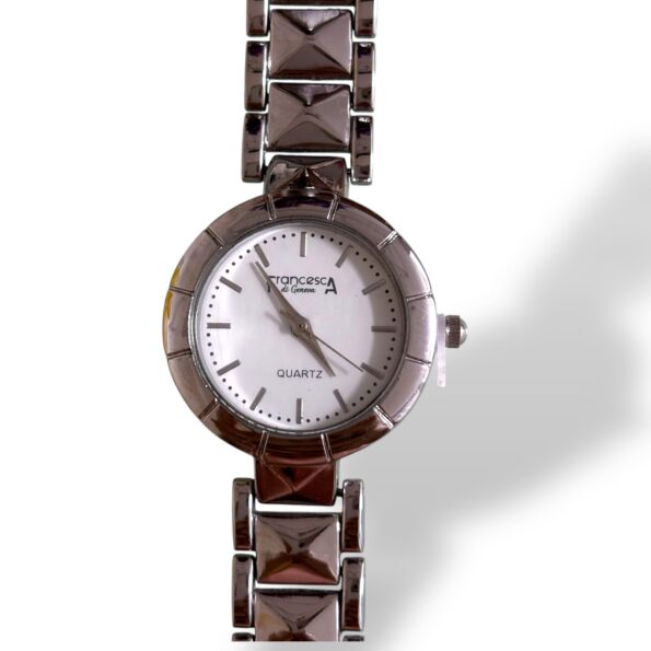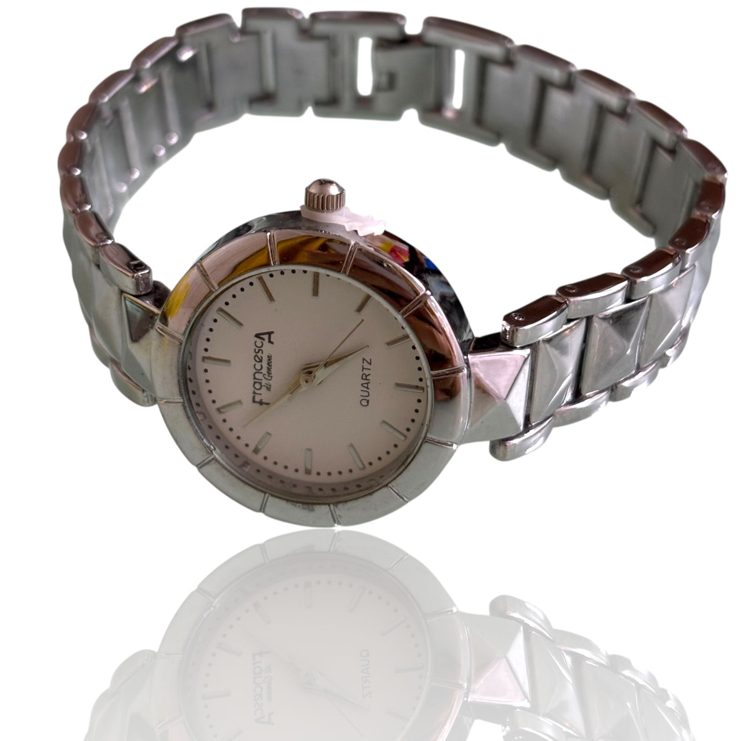 Ceas Francesca Di Geneva, cu brățară metalică argintie și cadran alb.
