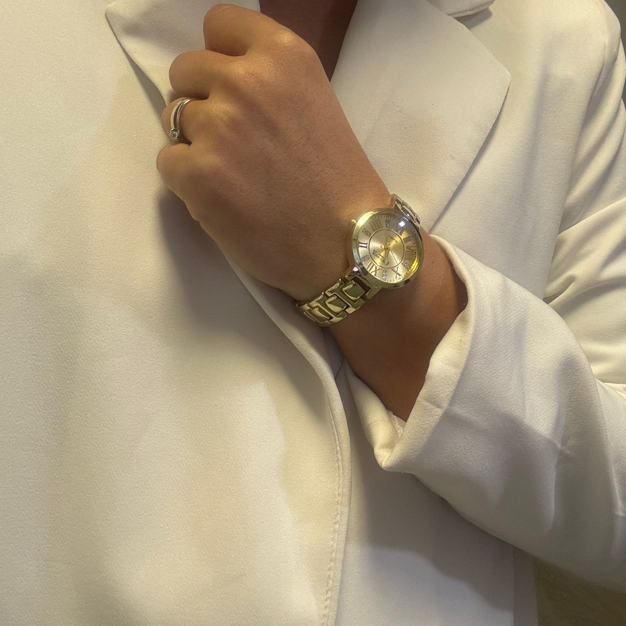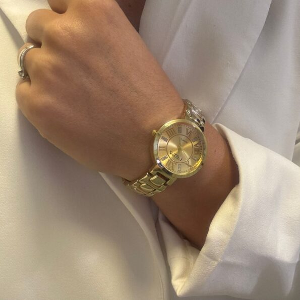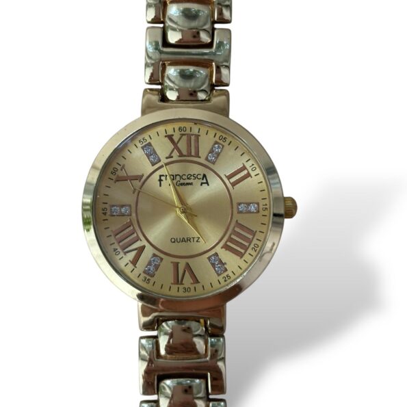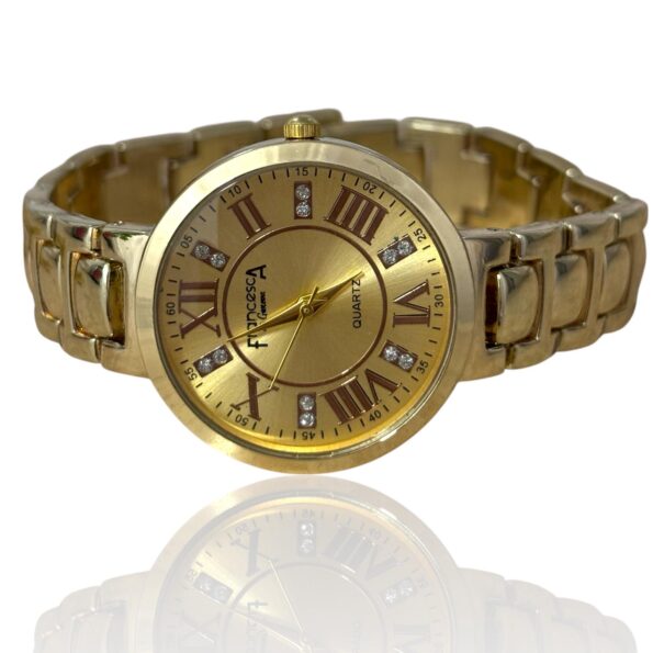 Ceas dama Francesca, cu brățară metalică aurie și cadran cu cigre romane.