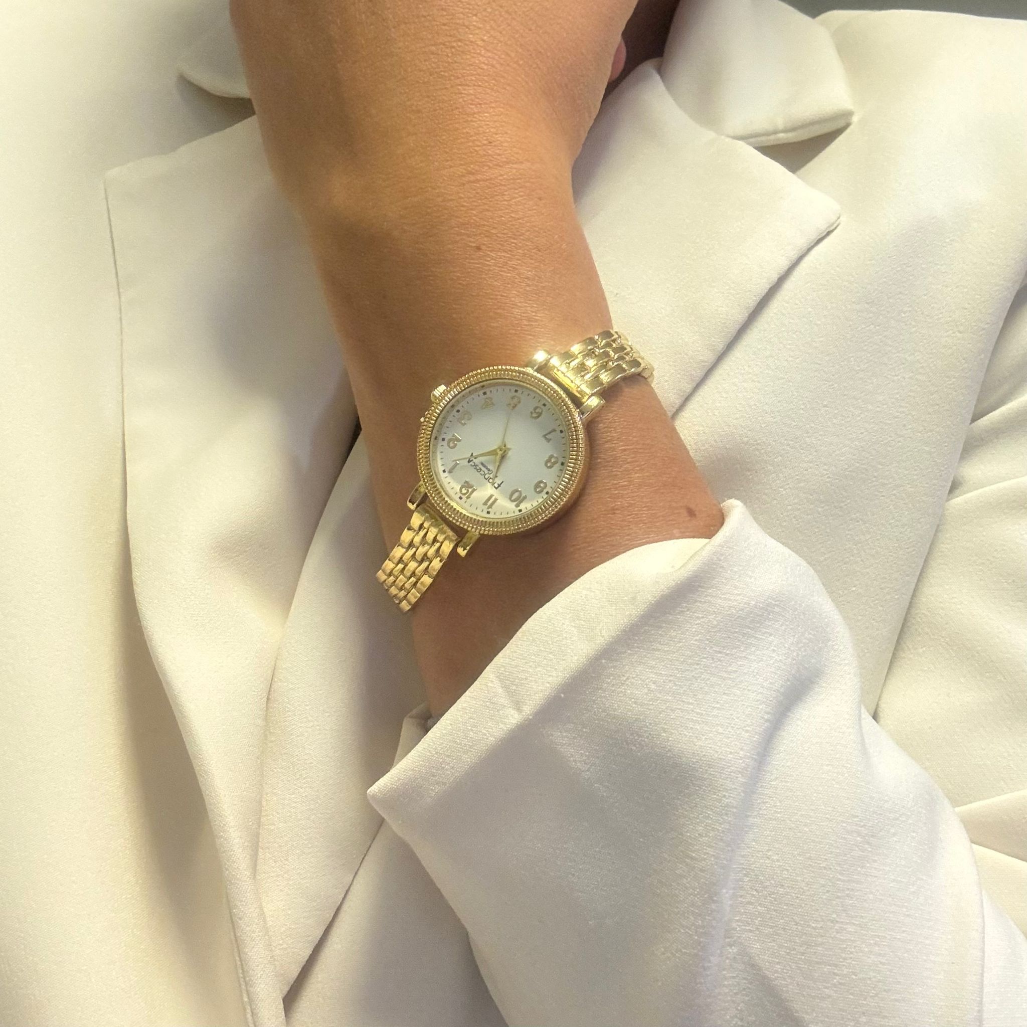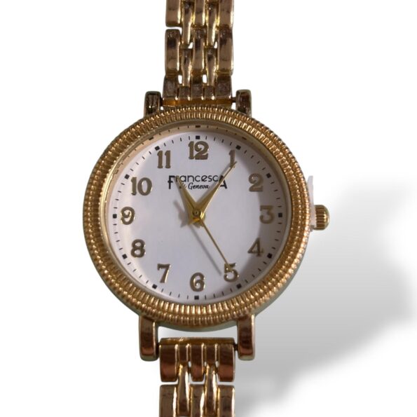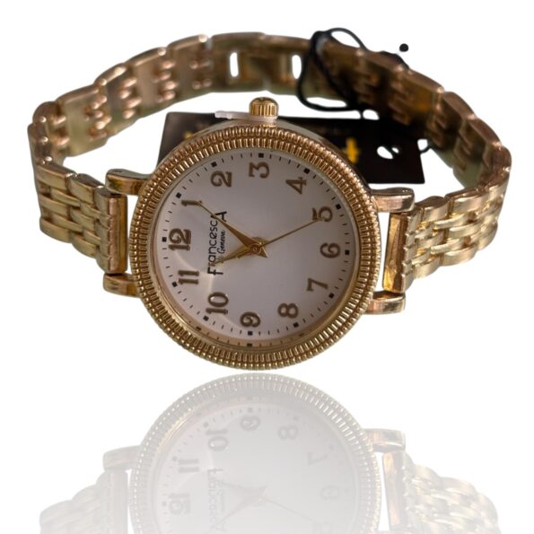 Ceas elegant Francesca Di Geneva, cu brățară metalică aurie și cadran alb cu cifre aurii reliefate.