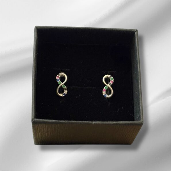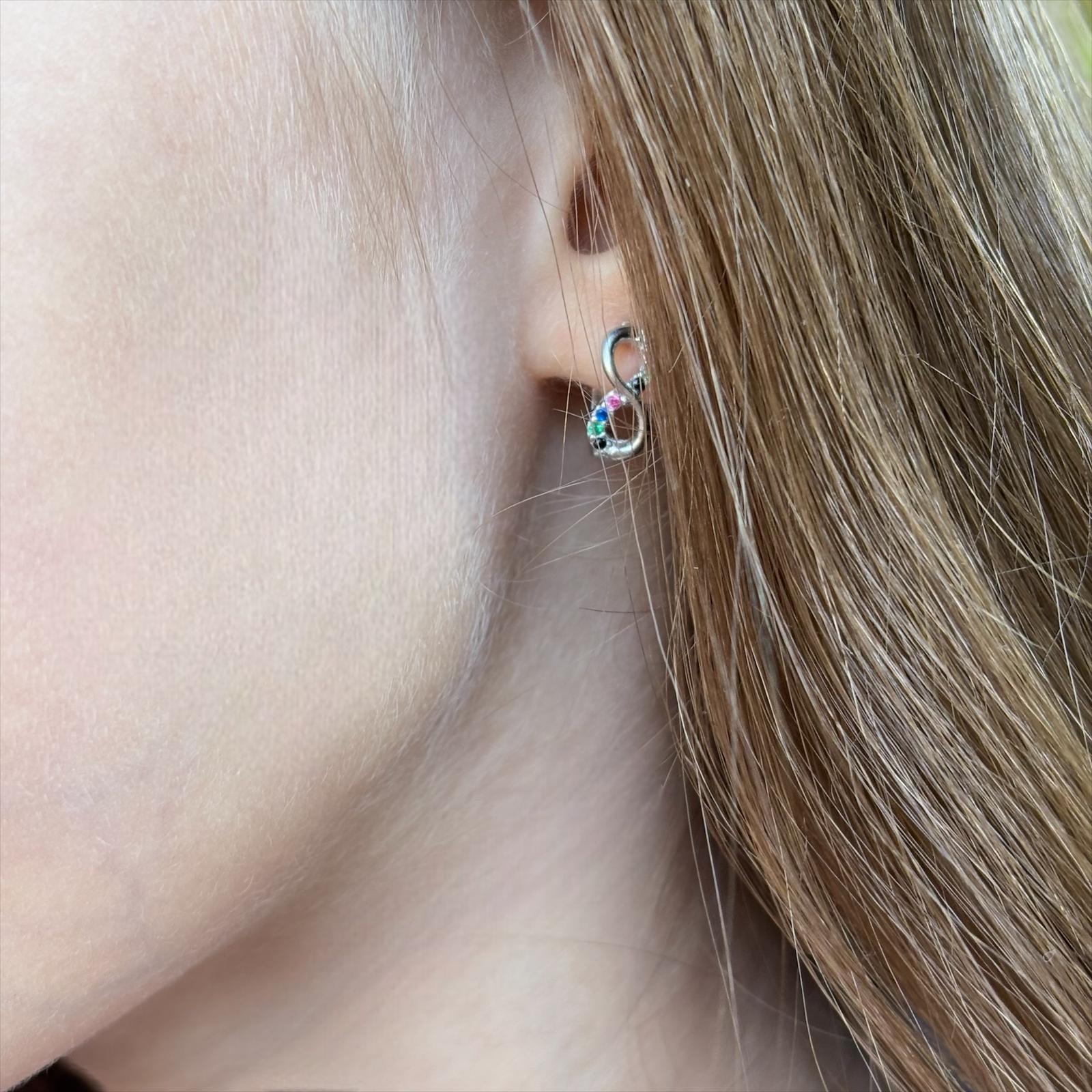 Descoperă farmecul subtil al acestor cercei din argint, cu un design delicat în formă de infinit și accente colorate din zirconii strălucitoare.