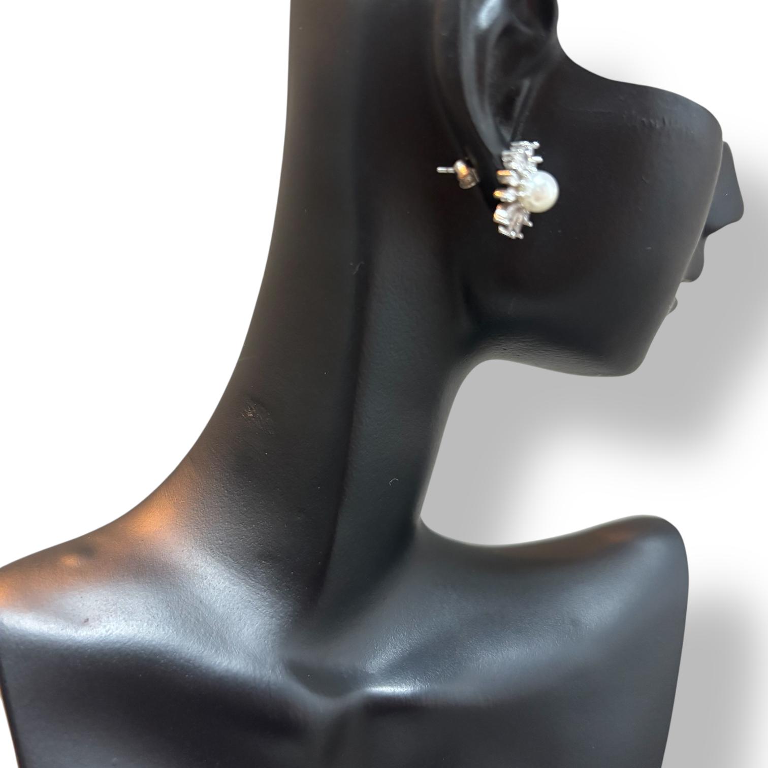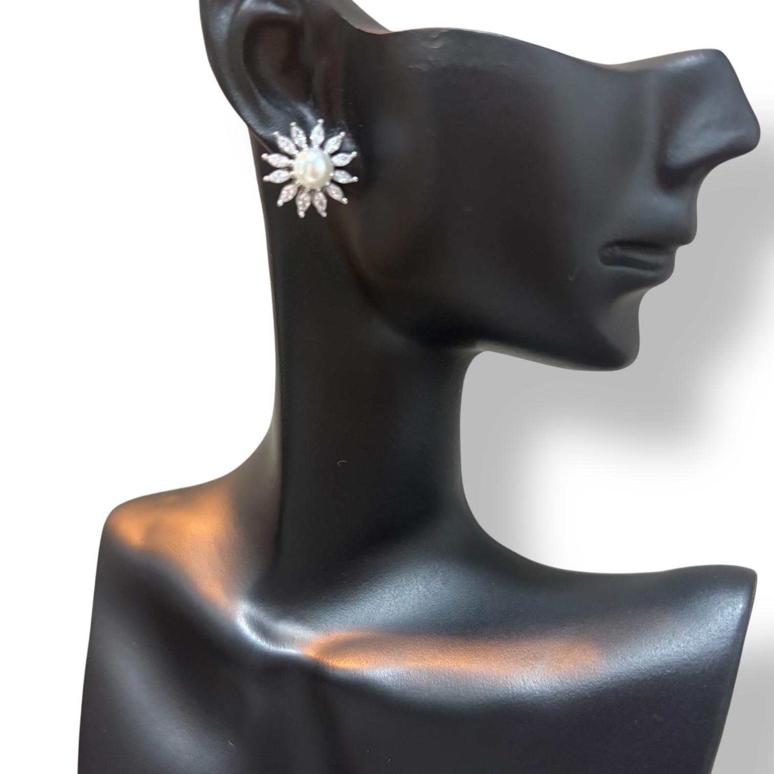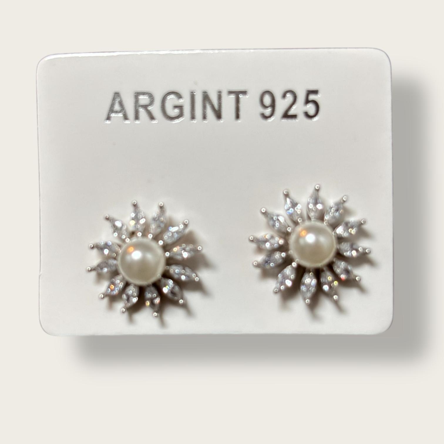 Acesti cercei eleganți din argint 925 au o perlă centrală și pietricele strălucitoare dispuse în formă de floare.