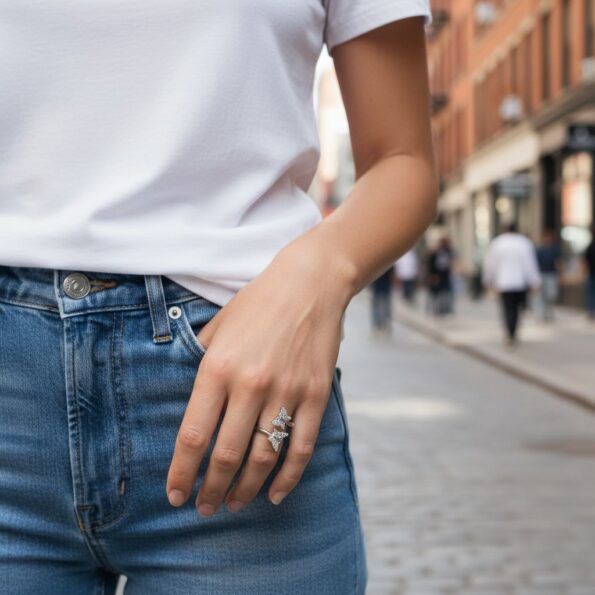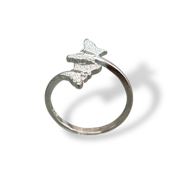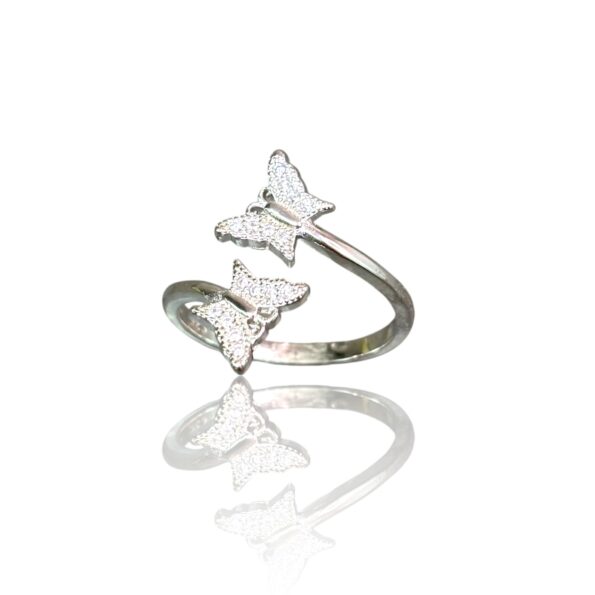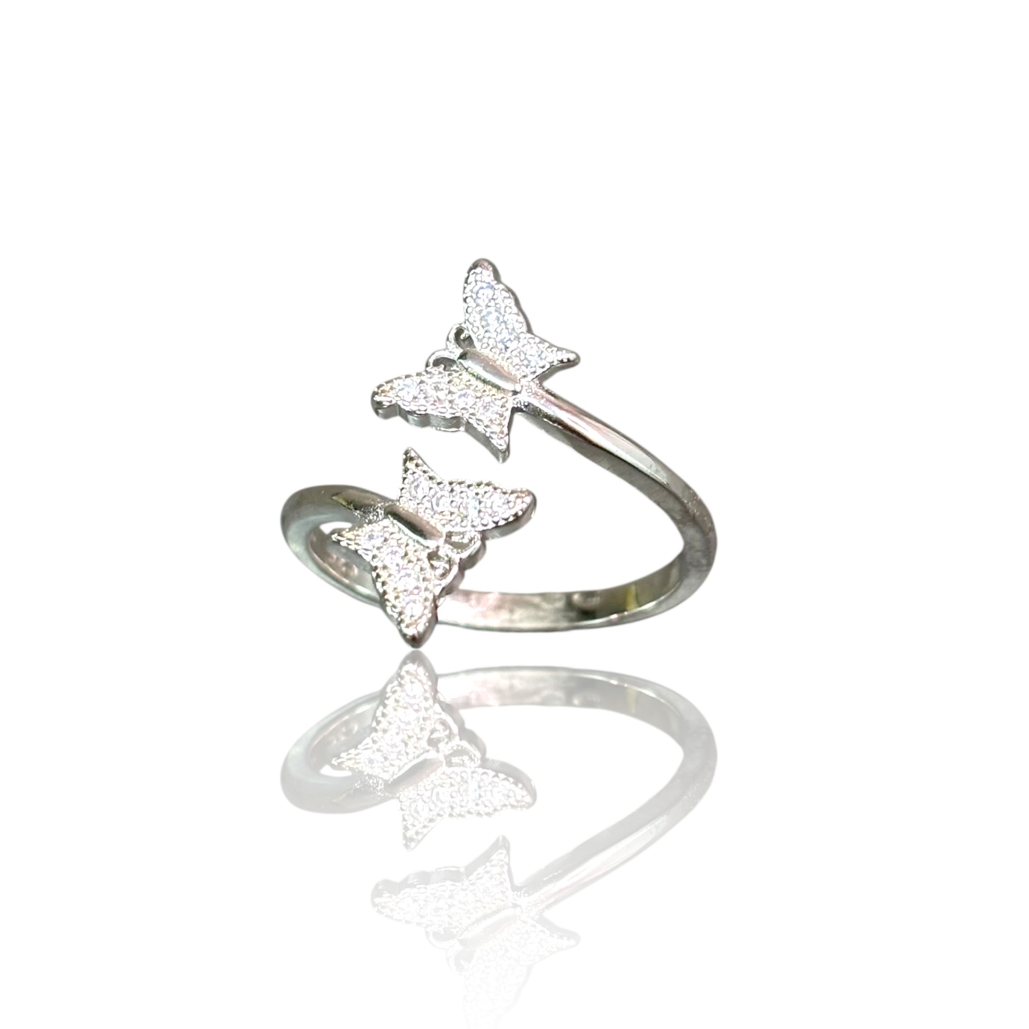 Inel elegant din argint 925, reglabil, decorat cu doi fluturi fin încrustați cu zirconii albe pentru un plus de strălucire.