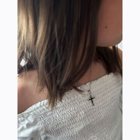 Această elegantă cruciuliță din argint combină simplitatea cu rafinamentul.