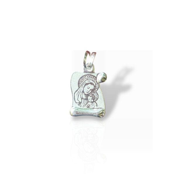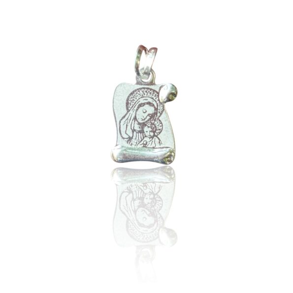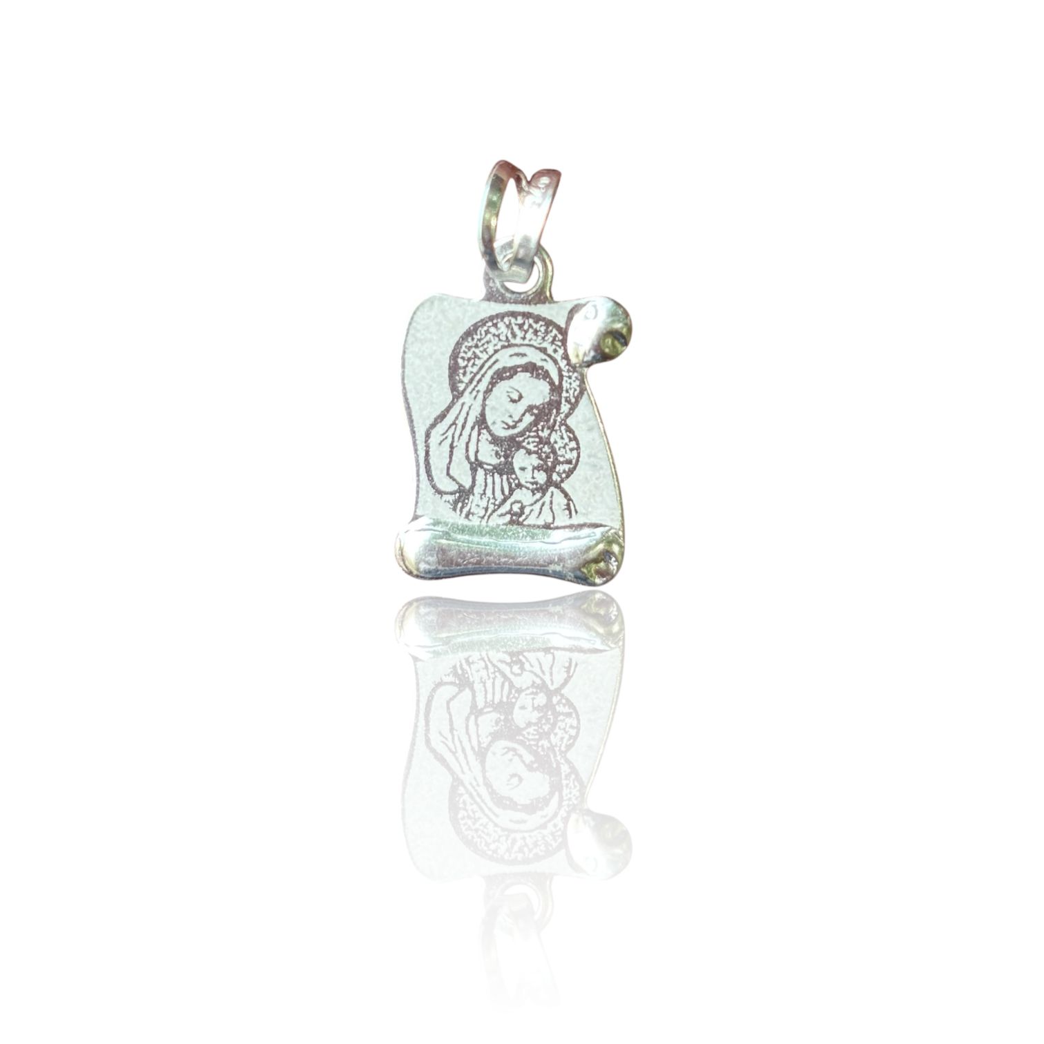 Pandantiv elegant din argint, cu design tip papirus și gravură delicată a Maicii Domnului cu Pruncul.