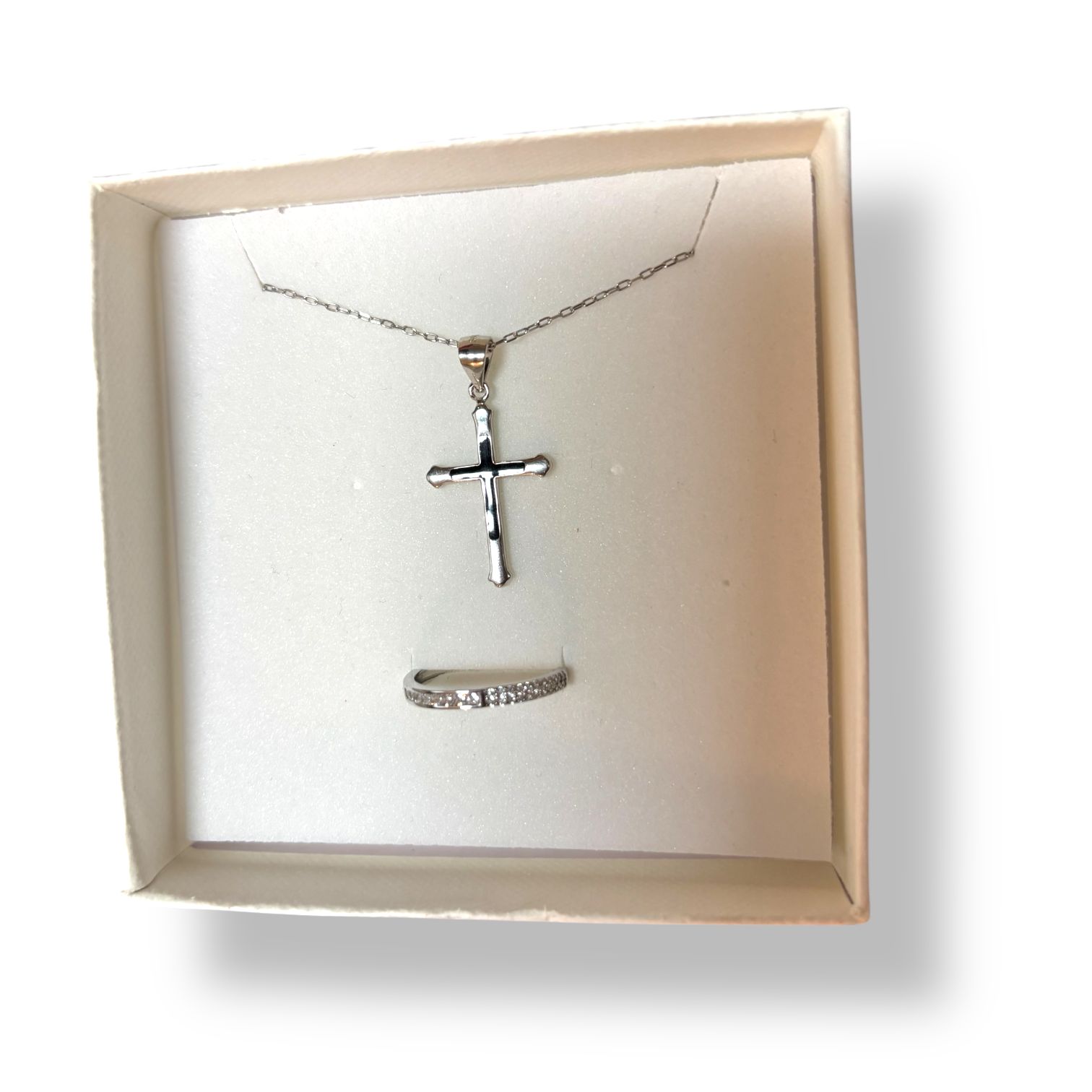 Setul este compus dintr-un lant delicat cu un pandantiv în formă de cruce cu design modern și un inel reglabil tip half-eternity, decorat cu cristale strălucitoare.