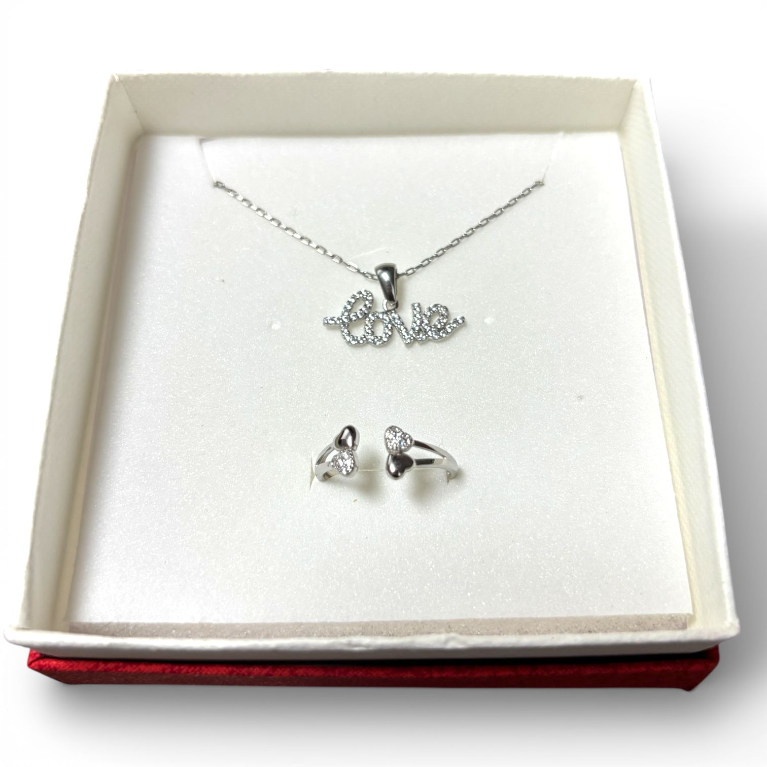 Set elegant din argint, compus din colier cu pandantiv „Love” decorat cu cristale fine și inel reglabil cu detalii în formă de inimă.